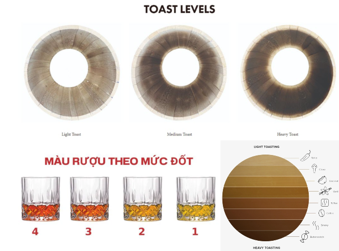 - Đốt rám bề mặt (Toasting): Mặt trong thùng cần được đốt ở các mức độ (nhẹ, vừa, đậm) để chuyển hóa hợp chất trong gỗ thành các mùi hương đặc trưng như vanilla, khói, hoặc bánh mì nướng.