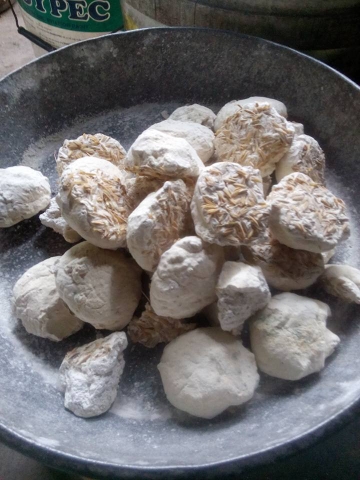 Cơm rượu sau khi cho ra từ khay để âm ấm và bắt đầu rắc men với tỉ lệ 1 lạng men / 10kg gạo. Men xay hoặc giã càng mịn, càng nhỏ càng tốt.