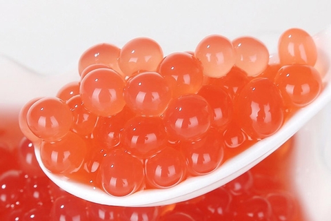 Hạt thủy tinh hay còn gọi là Popball nhìn bên ngòai có vẻ giống hạt trân châu với nhiều màu sắc khác nhau nhưng khi ăn vào thì lại hoàn toàn khác. Nếu như trân châu dai dai thì hạt thủy tinh với lớp vỏ mỏng, khi cắn sẽ vỡ và tan chảy ra 1 ít nước tùy theo vị như dâu, cam, yaourt, xoài, vải… nên còn có tên gọi là thạch nổ. Thạch thủy tinh được làm từ sự kết hợp giữa gốc calcium và chiết xuất rong biển.