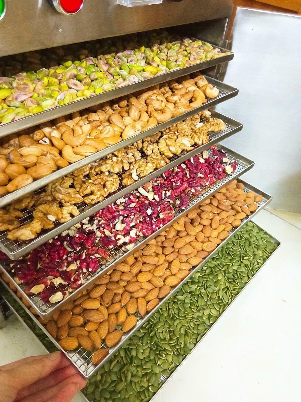 - Độ khô đồng đều: Máy sấy công nghiệp giúp kiểm soát nhiệt độ và độ ẩm chính xác, đảm bảo hạt óc chó được sấy khô đồng nhất.