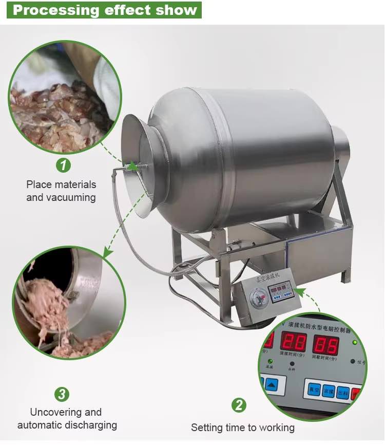 Đảm bảo tính đồng nhất: Máy hoạt động dựa trên các thông số cài đặt sẵn (thời gian quay, tốc độ, áp suất chân không). Điều này đảm bảo mọi mẻ thịt, dù được thực hiện bởi các nhân viên khác nhau, đều có chất lượng tẩm ướp như nhau.