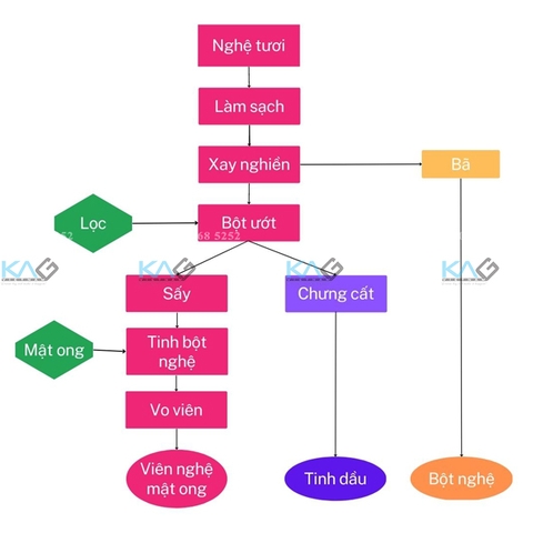 Nghệ tươi được lựa chọn từ những loại nghệ phù hợp với nhu cầu sử dụng như nghệ đỏ, nghệ vàng… được đưa vào Máy rửa công nghiệp loại bỏ đất cát, bụi bẩn. Tiếp đó, nghệ tươi được đưa vào Máy nghiền ép tạo thu nước, phần bã được chế biến thành bột nghệ.