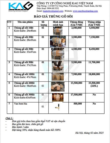 KAG Việt Nam là một trong những đơn vị lâu năm, có uy tín trong ngành rượu, chuyên cung cấp các thiết bị, dung cụ, phụ kiện sản xuất rượu thủ công, rượu vang… Thùng gỗ sồi cũng là một trong số những sản phẩm tạo nên thương hiệu của KAG. Với nguồn nguyên liệu gỗ sồi nhập khẩu 100% từ Nga và Mỹ, dưới bàn tay tài hoa của những người thợ thủ công lành nghề, Thùng rượu gỗ sồi có mức giá phải chăng mà chất lượng không thua kém các sản phẩm nước ngoài.