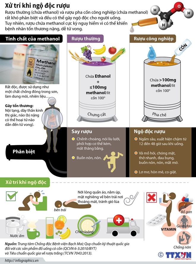 Bản thân rượu methanol có độc tính thấp, nhưng chính hai sản phẩm thoái hóa của nó là formaldehyde (formol) và acid formic tích tụ lại trong máu gây nên tình trạng toan chuyển hóa, tổn thương các mô khác như thận, gan, tổn thương võng mạc, thần kinh thị giác dẫn đến mù lòa. Theo tính toán y học, chỉ cần uống 30ml methanol 40 độ con người có thể bị mù, ngộ độc dẫn tới tử vong. Liều gây chết, lethal dose, LD50 của methanol khi uống thay đổi theo cá nhân, ước tính từ 20-150g.