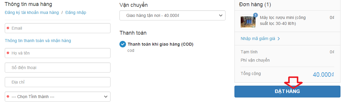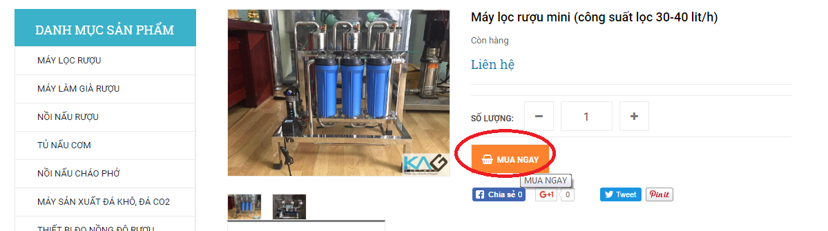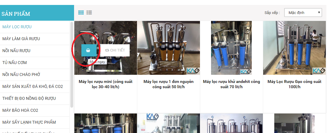 Ví dụ: bạn muốn mua sản phẩm "máy lọc rượu mini", thì bạn click vào biểu tượng giỏ hàng sản phẩm