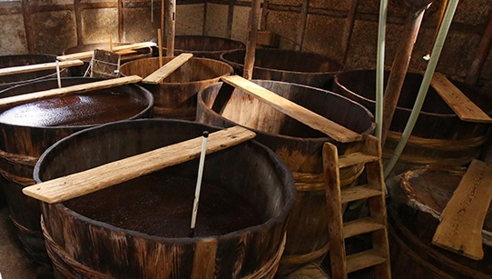 - Công đoạn tiếp theo là ủ nước tương, đa số nước tương được ủ trong những thùng gỗ, chum sành, gốm, nhưng ủ thùng gỗ sồi lại mang tới hương vị mới lạ, nhất là những thùng sồi đã được sửa dụng để ngâm rượu, hương vị rượu còn đọng trong thớ gỗ sẽ thấm vào tương trong quá trình lên men cho ra mùi thơm vị đậm đà hơn. Theo Yamamoto – nghệ nhân đời thứ năm làm nước tương truyền thống , thùng gỗ không chỉ là thùng chứa, mà nó còn là thành phần thiết yếu để làm nước tương, vì thớ gỗ là nơi lưu trú của hàng triệu vi sinh vật làm hương vị nước tương thêm đậm đà và thấm đượm. Vì những vi khuẩn này không thể sống trong thùng thép, rất nhiều công ty thương mại đã thêm vào nước tương đầy chất phụ gia.