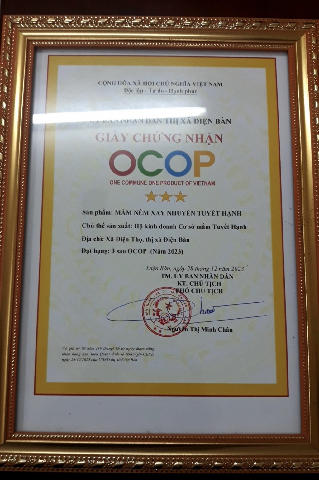 Mắm nêm Tuyết Hạnh được thành lập, sản xuất Mắm nêm làm nghề hàng chục năm nay. Với định hướng chiến lược xây dựng, khẳng định Thương hiệu sản phẩm mắm nêm của mình trên thị trường. Năm 2023, đơn vị được Ủy ban Nhân dân Thị xã Điện Bàn, tỉnh Quảng Nam, cấp giấy chứng nhận sản phẩm OCOP 3 sao.