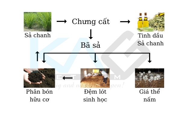 Qua nghiên cứu và ứng dụng thực tiễn, nhiều cơ sở sản xuất tinh dầu sả đã thực hiện quy trình sản xuất tinh dầu theo mô hình mới, vừa thu được lượng tinh dầu tối đa trong cây sả, vừa tận thu nguồn lợi dồi dào từ bã sả. Theo như chia sẻ của người dân Tiền Giang, Sả được chưng cất thu tinh dầu, phần bã sả được phơi khô còn 20% độ ẩm, một phần đem làm nghiền nhỏ làm đệm lót sinh học cho trang trại gia súc của gia đình anh, phần còn lại được chuyển tới cơ sở sản xuất phân bón gần đó… Có rất nhiêu cách để tận thu lợi ích từ cây sả, giúp tăng thu nhập đồng thời bảo vệ môi trường, giảm nguồn rác thải trong sản xuất.