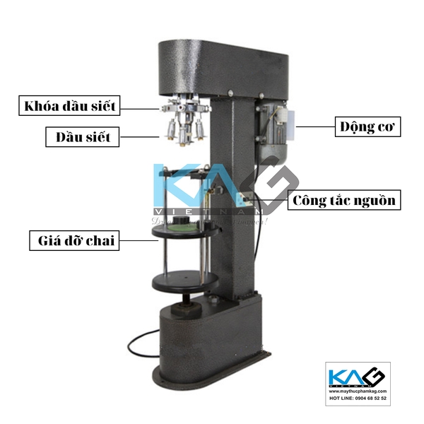 Bước cuối cùng trong quy trình sản xuất rượu là đóng nắp chai. Máy đóng nắp chai (hay còn gọi là máy xoáy nắp) bán tự động giúp thay thế hoàn toàn phương pháp thủ công, đảm bảo nắp được siết chặt, kín khít, ngăn chặn vi khuẩn xâm nhập và giữ cho chất lượng rượu luôn ổn định. Máy có thiết kế linh hoạt với trục điều chỉnh độ cao, cho phép đóng nắp nhiều loại chai có kích thước khác nhau. Hộp điều khiển có các núm chỉnh tốc độ, giúp bạn dễ dàng điều chỉnh quy trình đóng nắp theo yêu cầu.