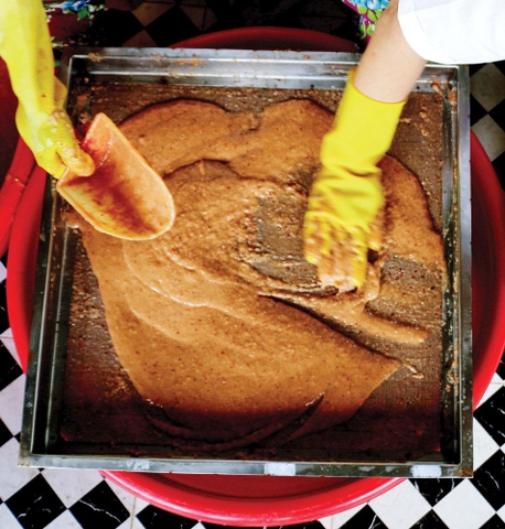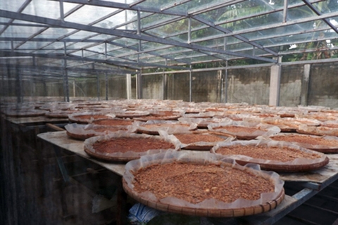 Sau khi xay nhuyễn, hỗn hợp được chà qua rây inox để loại bỏ hoàn toàn phần xác tôm, chỉ giữ lại phần tinh bột tôm. Công đoạn này giúp mắm đạt được độ sánh, mịn đặc trưng. Sau đó, phần tinh mắm này được dàn đều ra các khay inox to bản và đưa vào nhà kính để phơi nắng. Thay vì phơi ngoài trời và phải liên tục khuấy trộn, việc phơi trong nhà kính giúp quá trình lên men và làm sánh mắm diễn ra ổn định, đảm bảo vệ sinh an toàn thực phẩm, đồng thời vẫn tận dụng được ánh nắng mặt trời để mắm có màu đỏ tươi tự nhiên. Quá trình phơi kéo dài từ 10 đến 15 ngày cho đến khi mắm đạt độ sánh và màu sắc chuẩn.