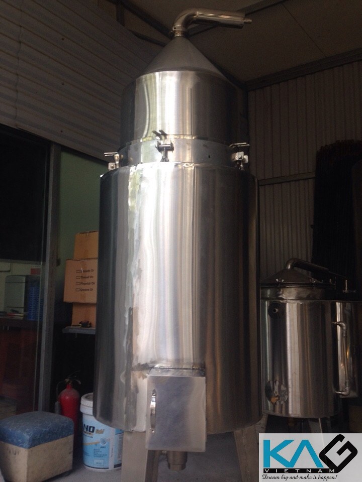 - Cuối cùng là ống phân phối hơi: lỗ phân phối hơi bố trí so le thành 2 hàng hướng về phía đáy nồi cất để cho hơi phân phối đều và lổ khỏi bị tắc do nguyên liệu rơi vào. Tổng tiết diện các lổ phân phối hơi bằng 2 lần tiết diện ống phân phối hơi, tiết diện của ống phân phối hơi lấy bằng tiết diện của ống dẫn hơi vào thiết bị và được xác định theo lượng hơi nước cần thiết dùng để chưng cất trong 1 giờ. Tốc độ hơi ở đây thường là 20m/s.
