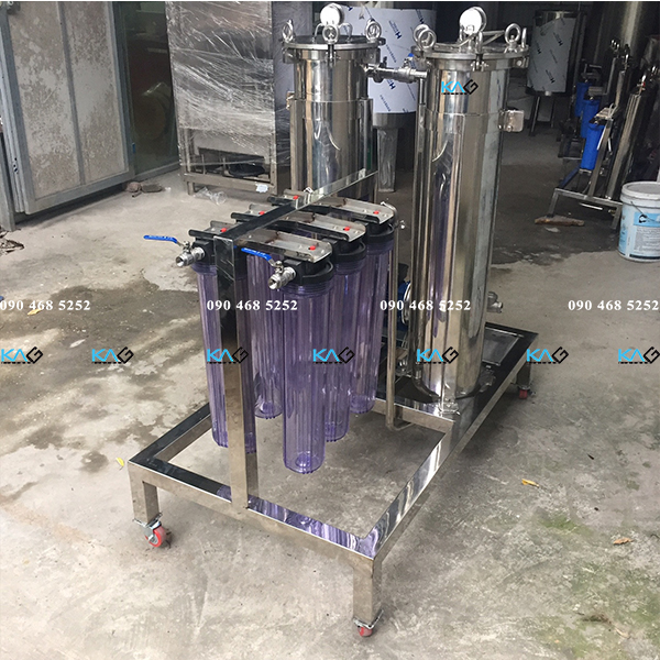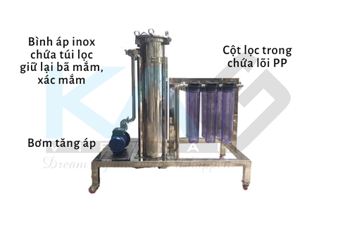 - Thiết bị lọc nước mắm bao gồm: 1 cột lọc inox chứa túi lọc nước mắm và 3 cột lọc trong chứa lõi lọc PP. Thiết bị được lắp ráp hoàn chỉnh và có thể sử dụng ngay lập tức.