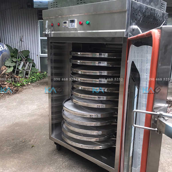 Máy sấy mâm xoay là máy tủ sấy đa năng tự động sấy theo trục không cần lật hay xoay đảo thực phẩm. Thiết bị sử dụng hệ thống khí nóng đối lưu cho khả năng tỏa nhiệt đồng nhất, thổi qua thực phẩm để lấy đi hơi nước. Ngoài ra bộ phận chỉnh lưu lượng gió giúp loại bỏ nhanh hơi nước trong buồng sấy, giúp giảm độ ẩm nhanh, nhanh khô, giòn.