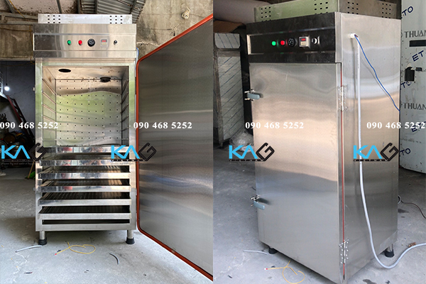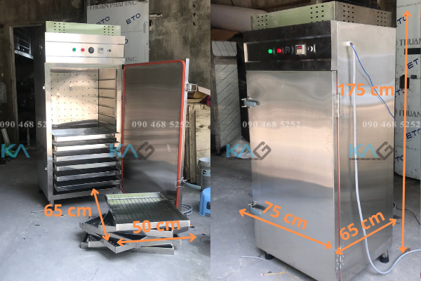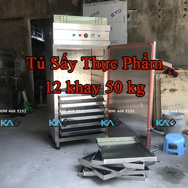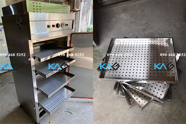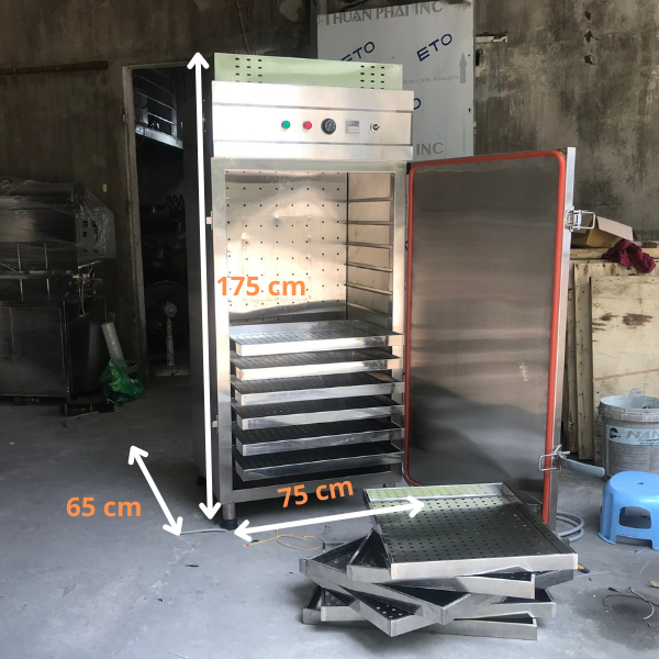 Máy sấy thực phẩm có thiết kế dạng tủ đứng 1 cánh, bên trong có 12 khay chứa nguyên liệu. Tủ sấy đa năng phù hợp với không gian sản xuất và chế biến hiện nay, đảm bảo VSATTP và nâng cao năng suất.