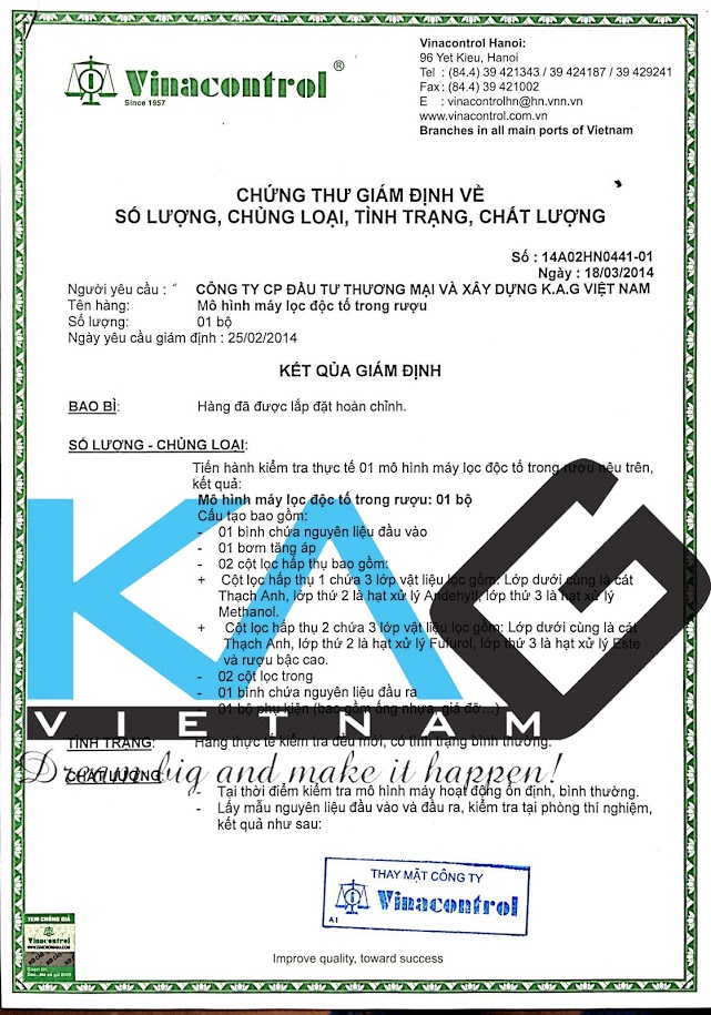 Giấy chứng thư giám định chất lượng sản phẩm của KAG