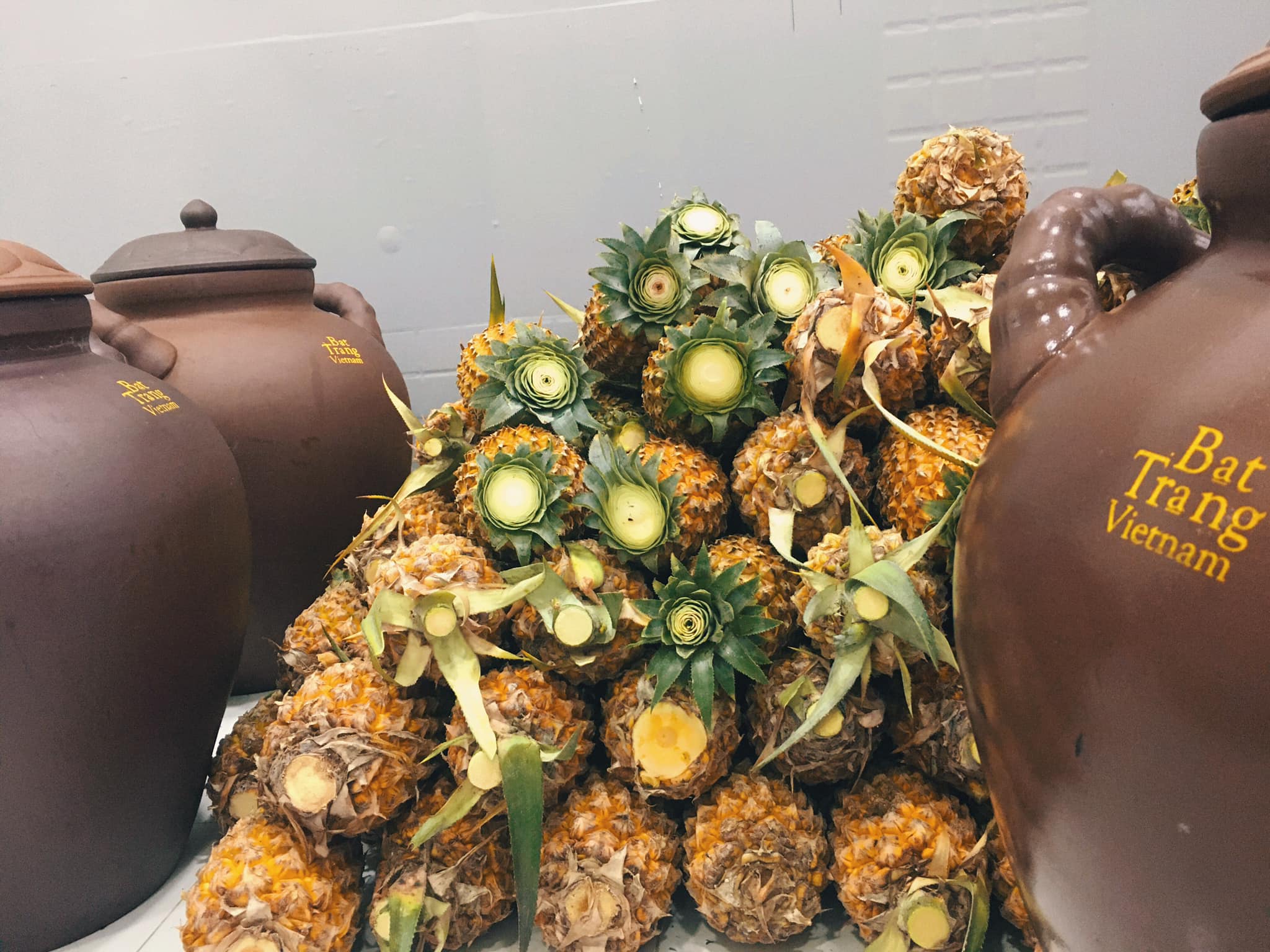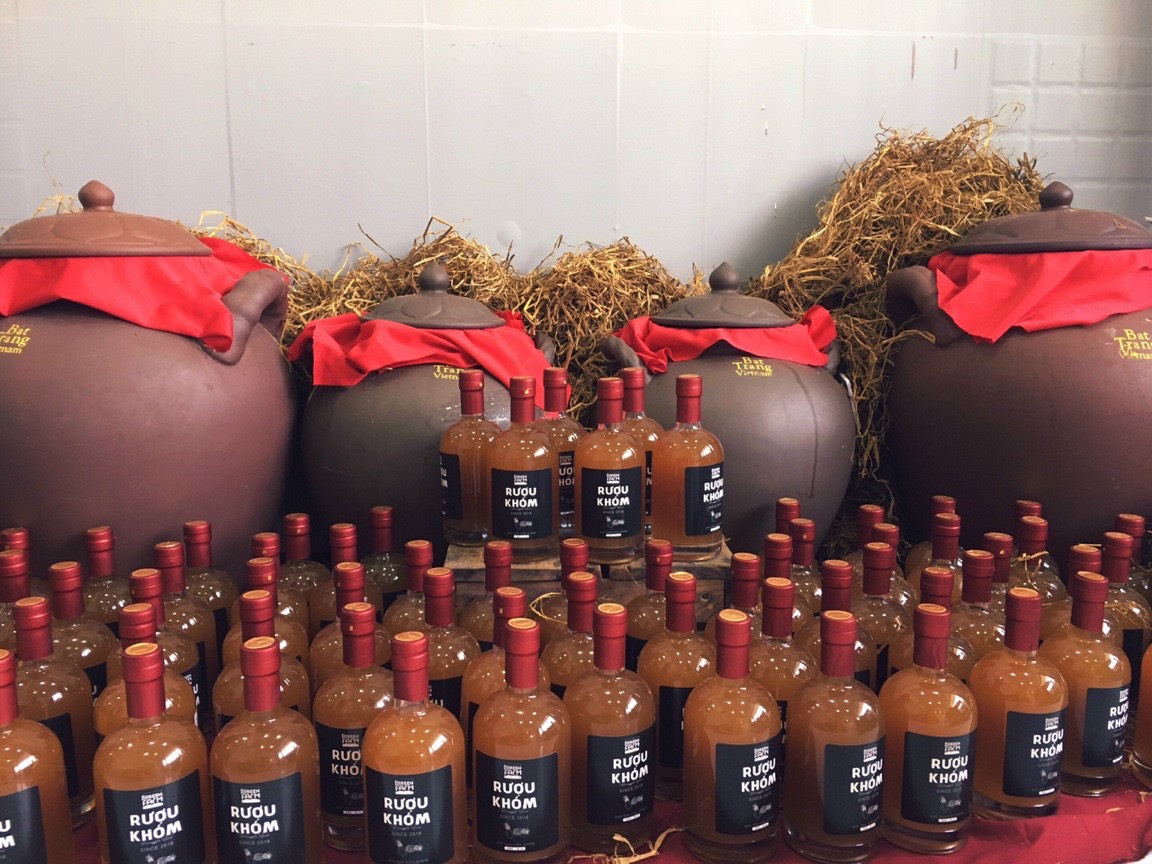 Trái khóm sau khi được sơ chế sẽ được lên men ủ với rượu và đường hữu cơ