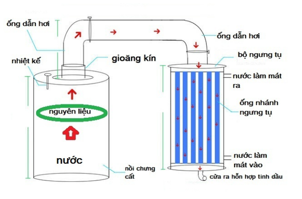 Nguyên liệu được đặt trên vỉ đỡ có khe, hoặc thiết kế các sọt chứa nguyên liệu. Nước phía dưới được đun nóng, tạo hơi bốc lên đi qua nguyên liệu, lôi cuốn các thành phần trong thực vật, trong đó có tinh dầu. Hơi lôi cuốn được ngưng tụ tại bộ ngưng tụ và trở thành hỗn hợp ngưng tụ. Tinh dầu do nhẹ hơn nên nổi lên trên bề mặt hỗn hợp này.