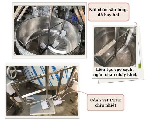 2. Cánh vét chuyên dụng bằng PTFE (Teflon): Đây là một trong những điểm khác biệt cốt lõi. Cánh khuấy được thiết kế với các lưỡi vét sát thành và đáy nồi, làm từ nhựa nguyên sinh chịu nhiệt cao cấp PTFE (Teflon). Vật liệu này có khả năng chống dính vượt trội, chịu nhiệt lên tới 260°C và hoàn toàn an toàn cho ngành thực phẩm, dược phẩm. Cánh vét liên tục cạo sạch lớp nguyên liệu bám dính, ngăn chặn hiện tượng cháy khét và đảm bảo chất lượng thành phẩm đồng đều.