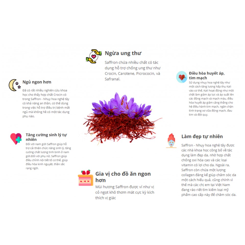 Nhụy hoa nghệ tây còn gọi là saffron, nhụy hoa nghệ tây sấy khô là thảo dược đắt giá nhất thế giới, không phải bỗng dưng loại nhụy hoa nghệ tây này được gọi là vàng đỏ. Những công dụng trong mọi lĩnh vực về sắc đẹp, sức khỏe hay ẩm thực đã khiến saffron trở thành thần dược cho mọi nhà. Hiện nay Saffron đã được sử dụng rộng rãi ở khắp mọi nơi trên thế giới.