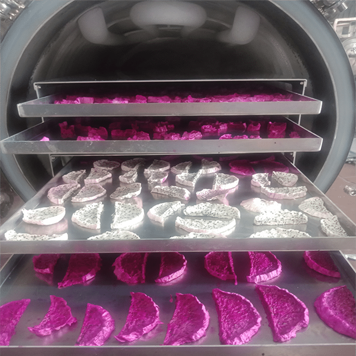 Thanh long trong khay sẽ được giở lật theo chu kỳ, đảm bảo các bề mặt được thoát ẩm đều đặn trước khi đạt độ ẩm cần thiết của sản phẩm sấy dẻo. Đến một độ khô nhất định, sản phẩm được đưa ra làm mát và đóng bao bì.