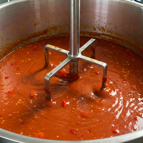 Sau khi cho tất cả nguyên liệu vào nồi, bật cánh khuấy để hỗn hợp được trộn đều. Cài đặt thời gian và nhiệt độ của hệ thống gia nhiệt sao cho phù hợp với lượng nguyên liệu và độ đặc mong muốn của sản phẩm. Thông thường, quá trình nấu sẽ diễn ra trong một khoảng thời gian nhất định, dưới sự kiểm soát chặt chẽ về nhiệt độ để ớt chín đều, giải phóng hết hương vị và tạo độ sánh mịn tự nhiên cho sốt ớt, tương ớt. Cánh khuấy hoạt động liên tục giúp nhiệt lượng phân bố đều khắp bồn, ngăn ngừa tình trạng cháy cục bộ làm ảnh hưởng đến chất lượng sốt.