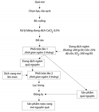 Quả mơ ngâm đường theo tỷ lệ 1:1 trong 3 tháng thu được sirô nồng độ chất khô 50°Bx và nồng độ axit cao, độ pH thấp nên có thể ức chế vi sinh vật và bảo quản trong điều kiện thường. Pha loãng siro đến 20°Bx và xử lý bằng enzym Pectinex 3XL với nồng độ 0,04%, sau đó được điều chỉnh độ pH, phối chế dịch lên men, thêm đường đến 25°Bx. Thời gian lên men từ 10 - 15 ngày trong điều kiện nhiệt độ 25°C - 30°C và cần giữ ổn định để sản phẩm có chất lượng cao.
