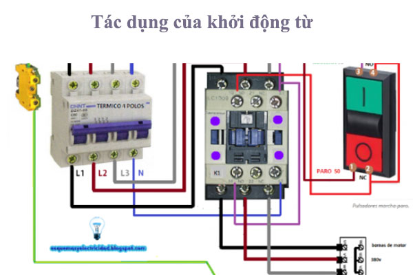 Nguyên lý hoạt động của contactor được trình bày như sau: Khi cung cấp điện áp cho cuộn dây bằng nút nhấn khởi động M thì cuộn dây của contactor có điện hút lõi thép di động cùng mạch từ sẽ khép kín lại. Khi đó các tiếp điểm chính và tiếp điểm phụ thường hở sẽ duy trì mạch điều khiển khi buông tay khỏi nút nhấn khởi động. Khi nhấn nút dừng D thì khởi động từ bị ngắt điện, dưới tác dụng của lò xo nén thì phần lõi di động sẽ trở về vị trí ban đầu và tiếp điểm trở về trạng thái thường hở, động cơ dừng hoạt động. Còn khi có sự cố quá tải ở động cơ thì rơ le nhiệt sẽ thực hiện thao tác làm ngắt mạch điện ở cuộn dây, đồng thời ngắt mạch điện ở khởi động từ và dừng động cơ điện lại.