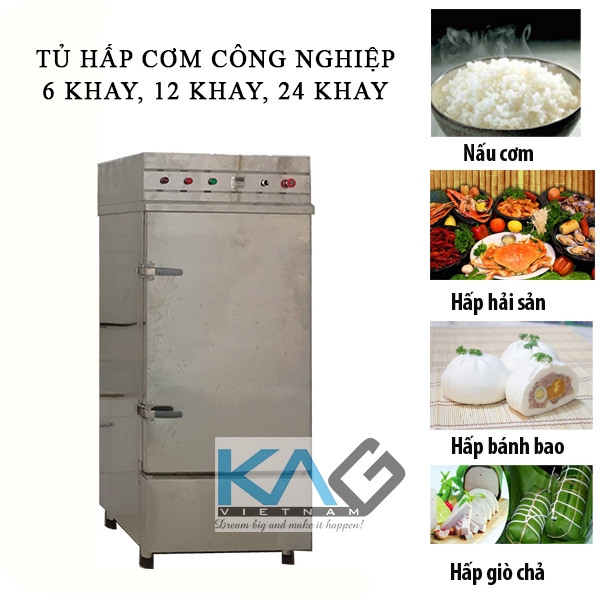 Các khay cơm 60x40x5cm được bố trí phù hợp với kích thước tủ (6 khay, 10 khay, 12 khay, 24 khay…). Mỗi khay có thể chứa khoảng 4 kg nguyên liệu. Đặc biệt, bạn có thể nấu nhiều loại thực phẩm trong cùng một mẻ (nấu cơm, hấp khoai, thổi xôi…).