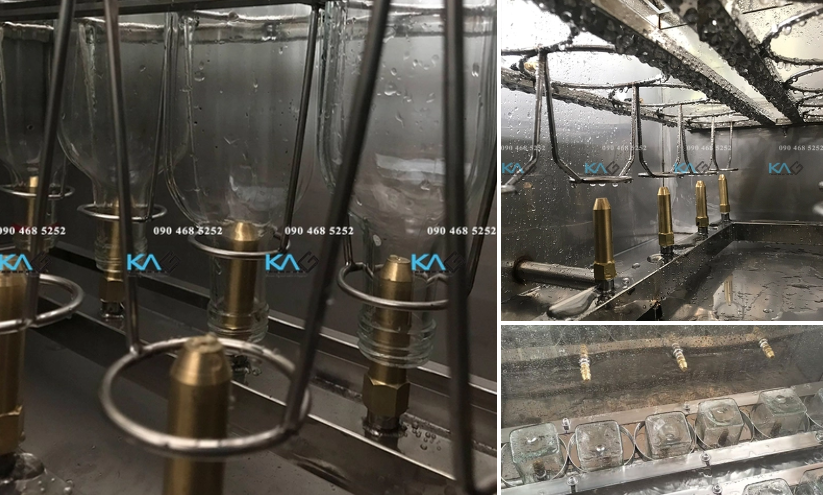 Sau đó chai lọ được đưa vào máy và úp ngược xuống các giá đỡ Inox cố định đặt bên trong, rồi đóng nắp để bắt đầu quá trình sục rửa chai.