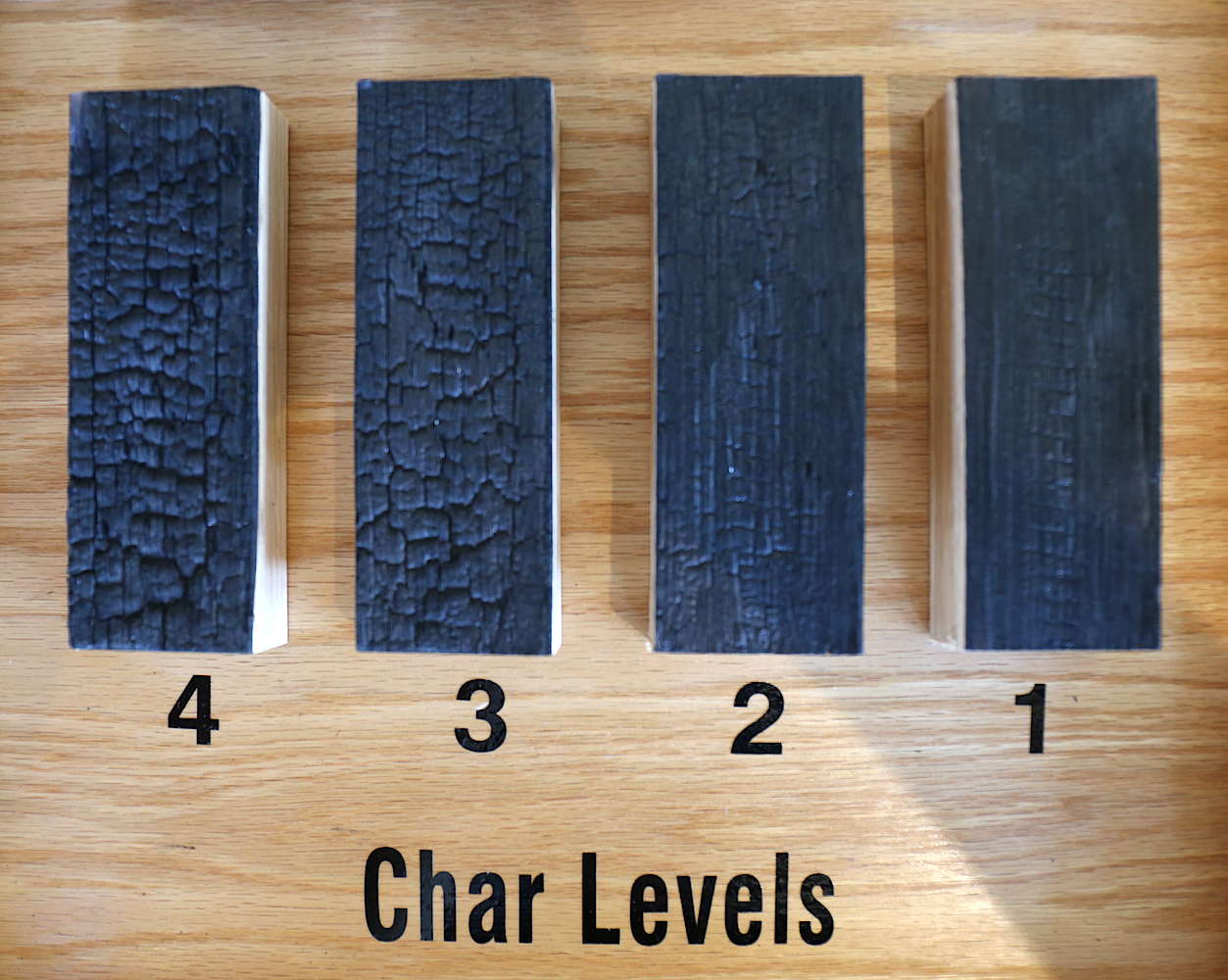 Thuật ngữ Charred tức là “cháy thành than” được hiểu là thùng gỗ sồi được nướng cháy một phần, và phần bị cháy có màu đen bên trong, dày khoảng 0,3 cm. Thùng gỗ sồi charred này thường không sử dụng để ủ rượu vang mà dùng trong quá trình sản xuất rượu Bourbon. Phần gỗ cháy đó hoạt động như bộ lọc than hoạt tính, có thể giúp loại bỏ các hợp chất lưu huỳnh khỏi rượu Whisky và làm cho đồ uống thơm ngon hơn. Thùng gỗ sồi charred cũng có màu đậm hơn, mùi khói hoặc caramel, mật ong và đậm vị cay.
