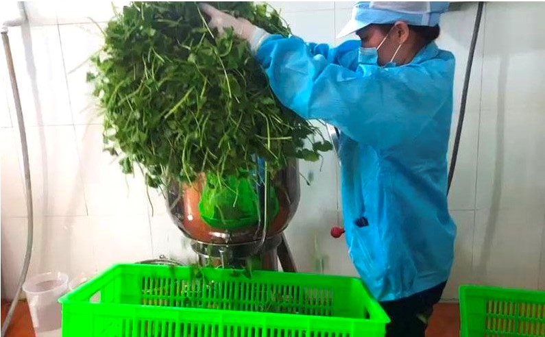 - Tiếp theo, rau má tươi được ngâm trong bể rửa khử trùng (nước muối) khoảng 15 phút, để loại bỏ vi khuẩn và vi sinh vật gây hại nhằm đảm bảo vệ sinh an toàn thực phẩm.