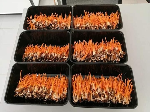 - Nhân tạo: Nuôi cấy nấm trên cơ thể ấu trùng nhộng tằm hoặc trên cơ chất như gạo lứt, ngô, đậu xanh, vỏ trứng,…và thu hoạch nấm. Giá thành đa dạng tùy chất lượng, khoảng 40 – 55 triệu đồng/kg khô.