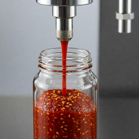 Sau khi để nguội, tương ớt sẽ được chuyển sang công đoạn chiết rót vào chai, lọ bằng máy chiết rót tương ớt chuyên dụng. Loại máy này thường sử dụng khí nén piston, giúp việc chiết rót các dung dịch sệt và có topping như tương ớt, tương cà, sa tế trở nên dễ dàng và nhanh chóng.